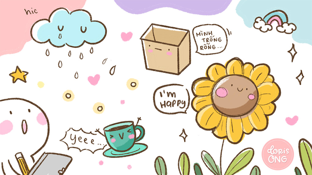 Những đồ vật được bạn minh hoạ đơn giản, khi thêm biểu tượng cảm xúc vào sẽ trông rất dễ thương. Một cái hoa đang cười, một đám mây đang khóc, ly cà-phê với khuôn mặt hớn hở nhiều năng lượng, hoặc chiếc điện thoại với con mắt chữ “x” vì hết pin. Hãy thử xem nào.