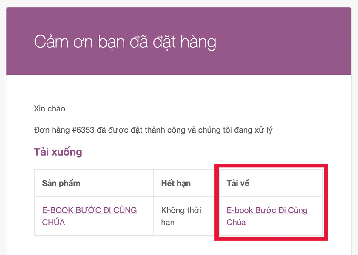 Bạn kiểm tra hộp thư mail mà bạn dùng để mua sản phẩm, bạn vào mail có tiêu đề “Đơn hàng tại Doris Store đã được đặt “. Tại mục Tải về, nhấn vào liên kết “Tải xuống“.